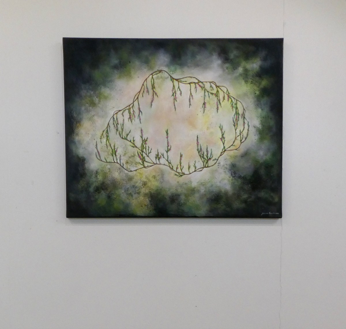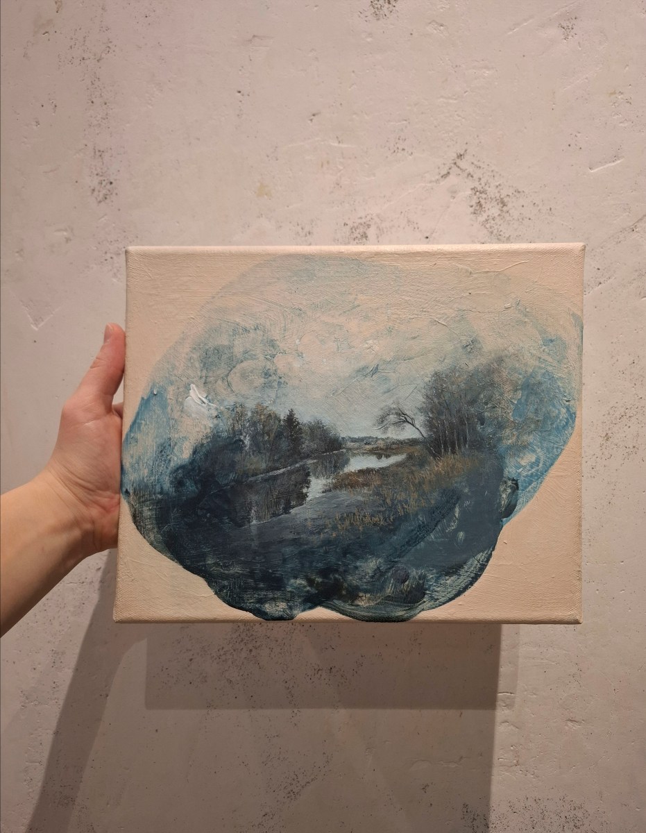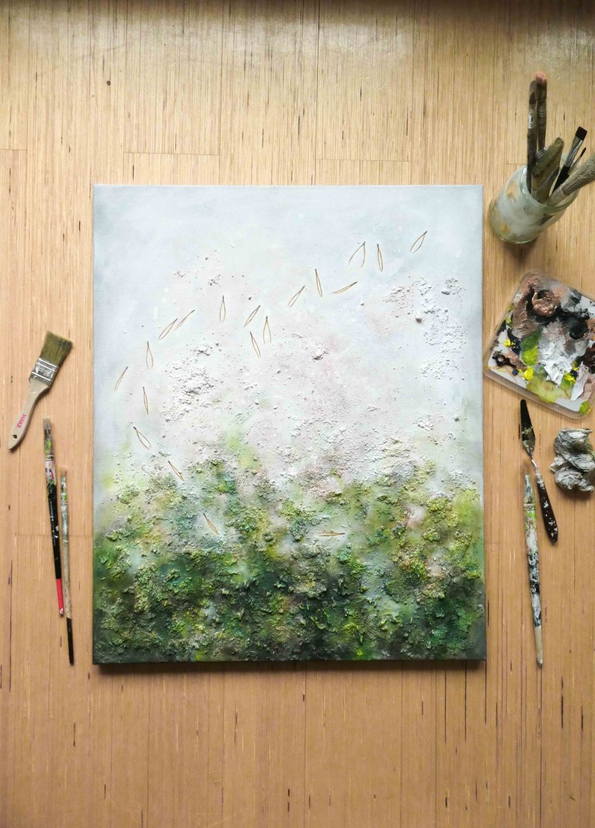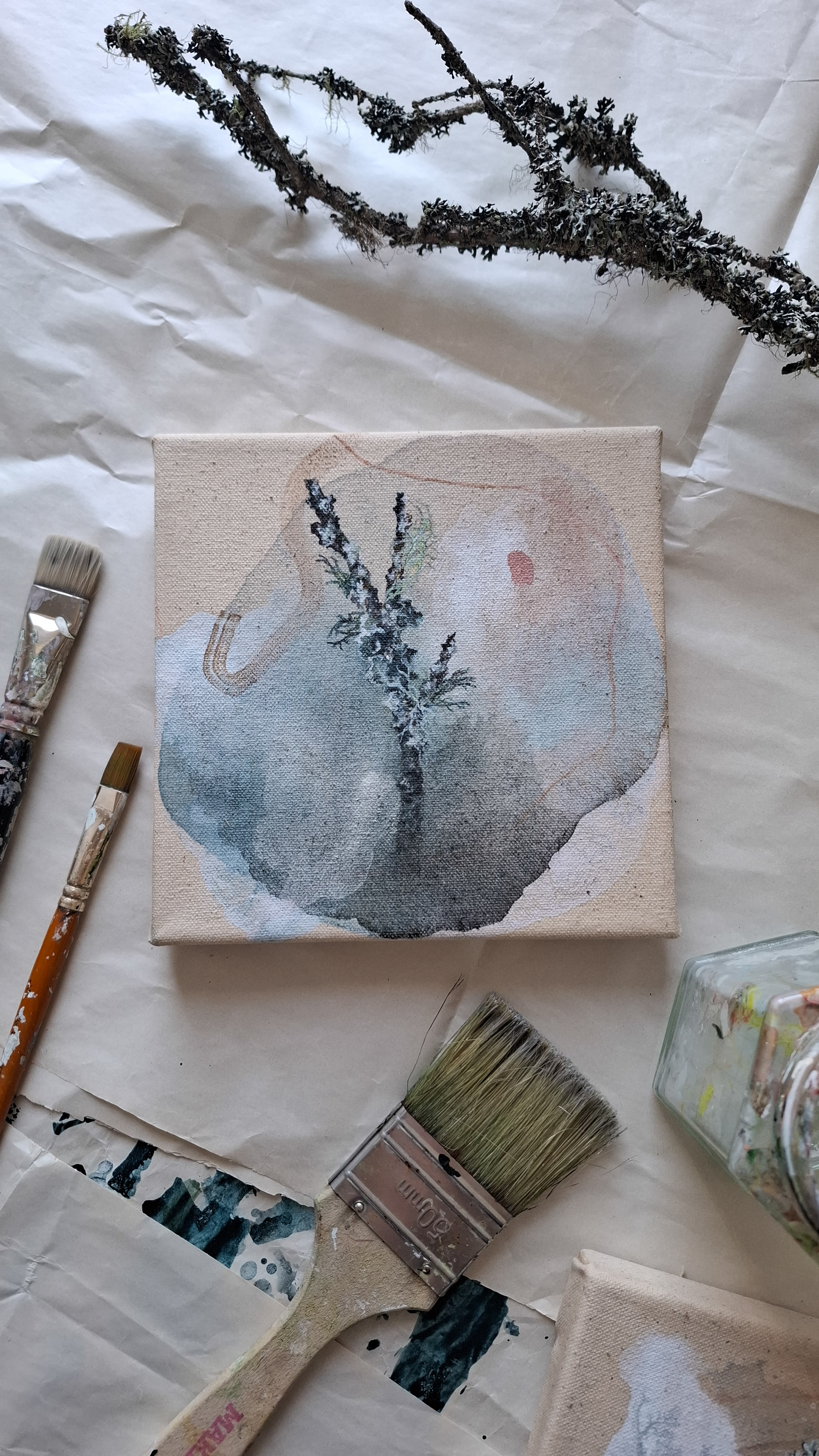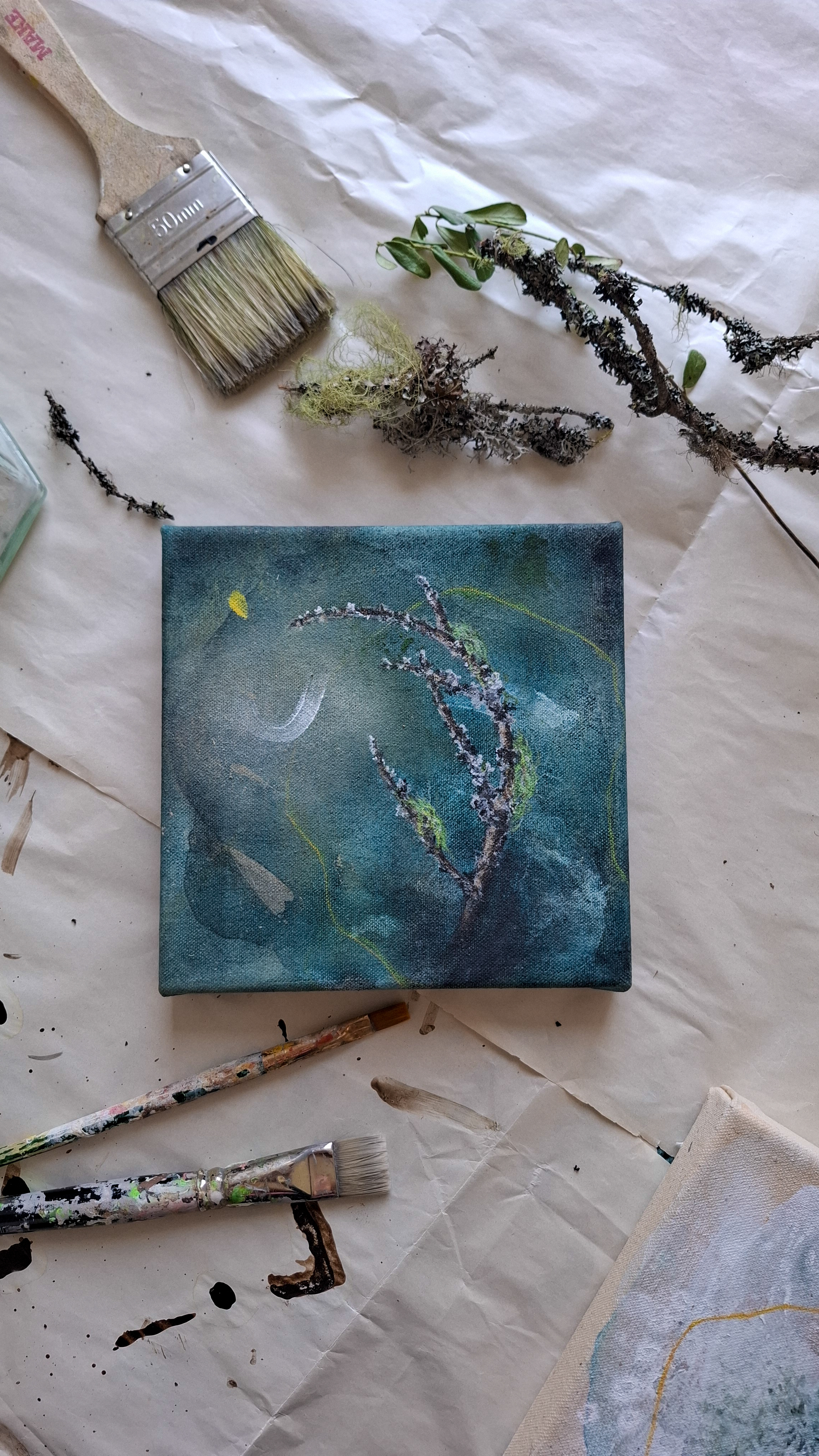 Teos on toteutettu 0,9 cm vahvuiselle vanerille, teoksen takana ripustuskiinnike, joka tuo teoksen kauemmas seinäpinnasta luoden kolmiulotteisen vaikutelman