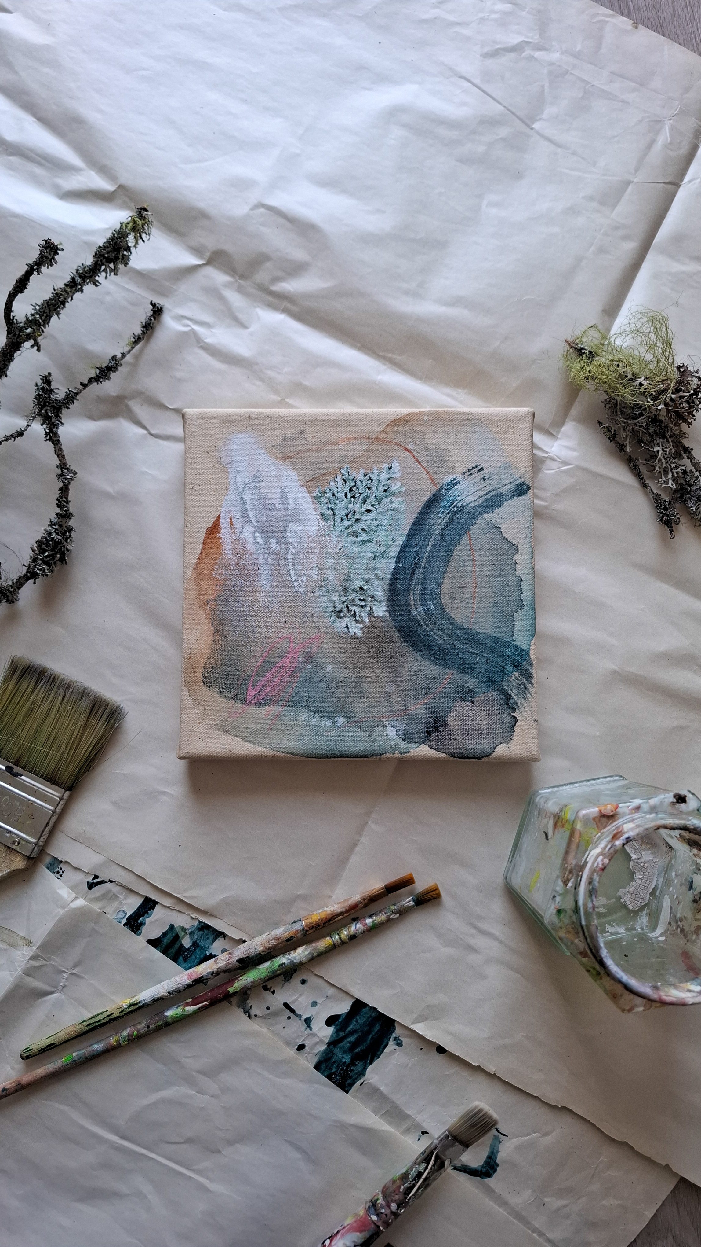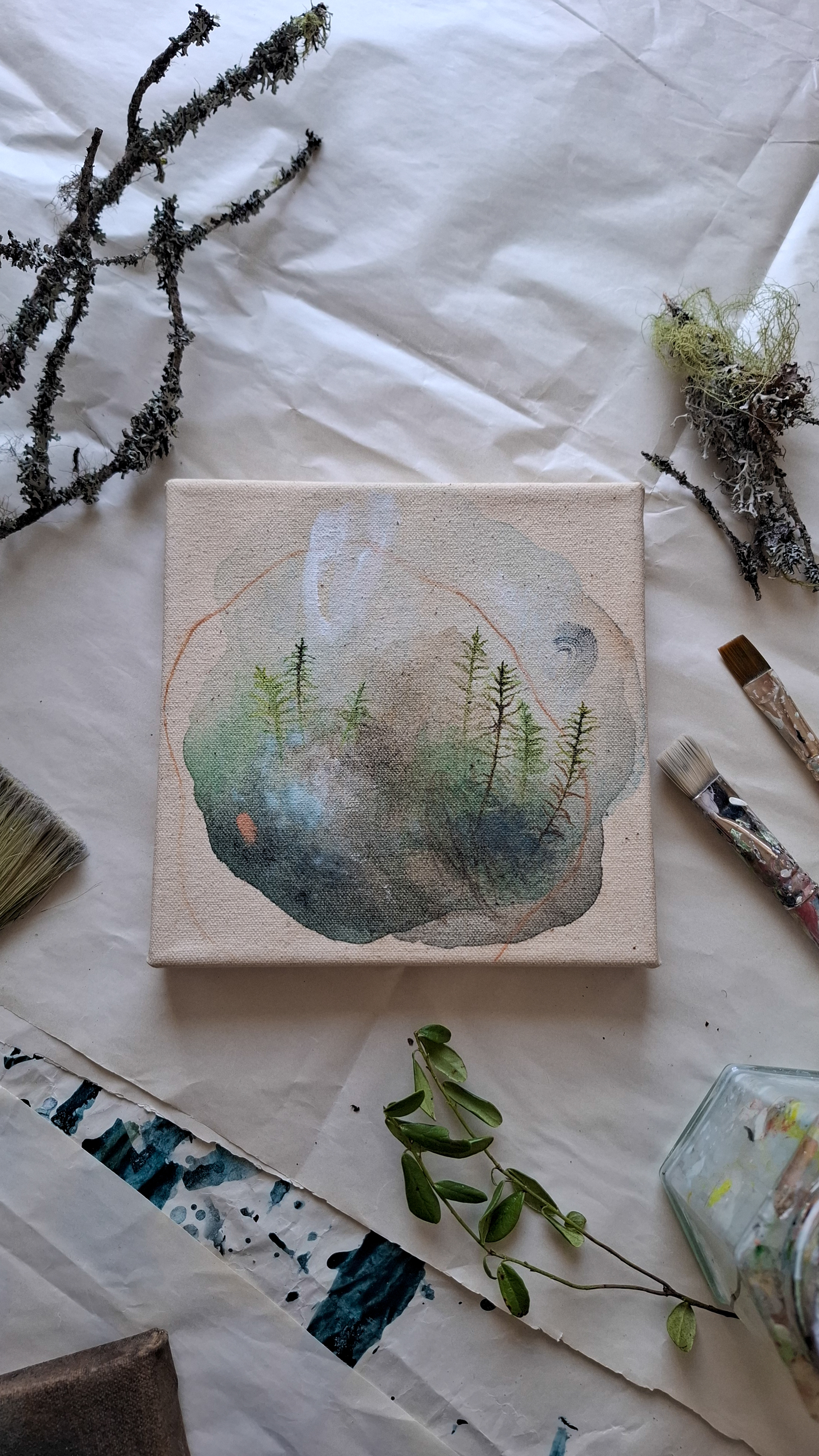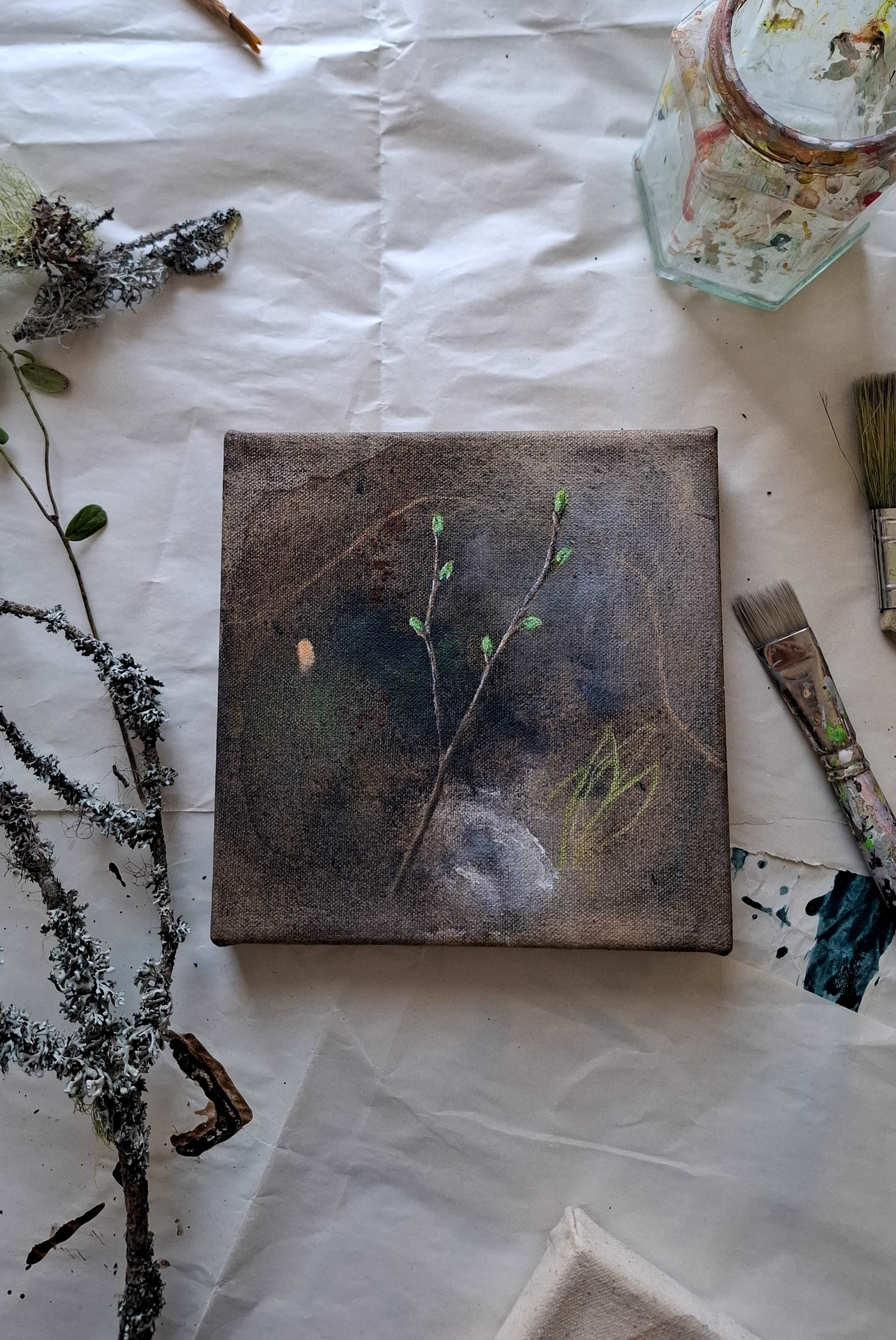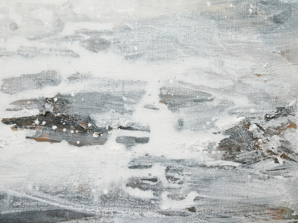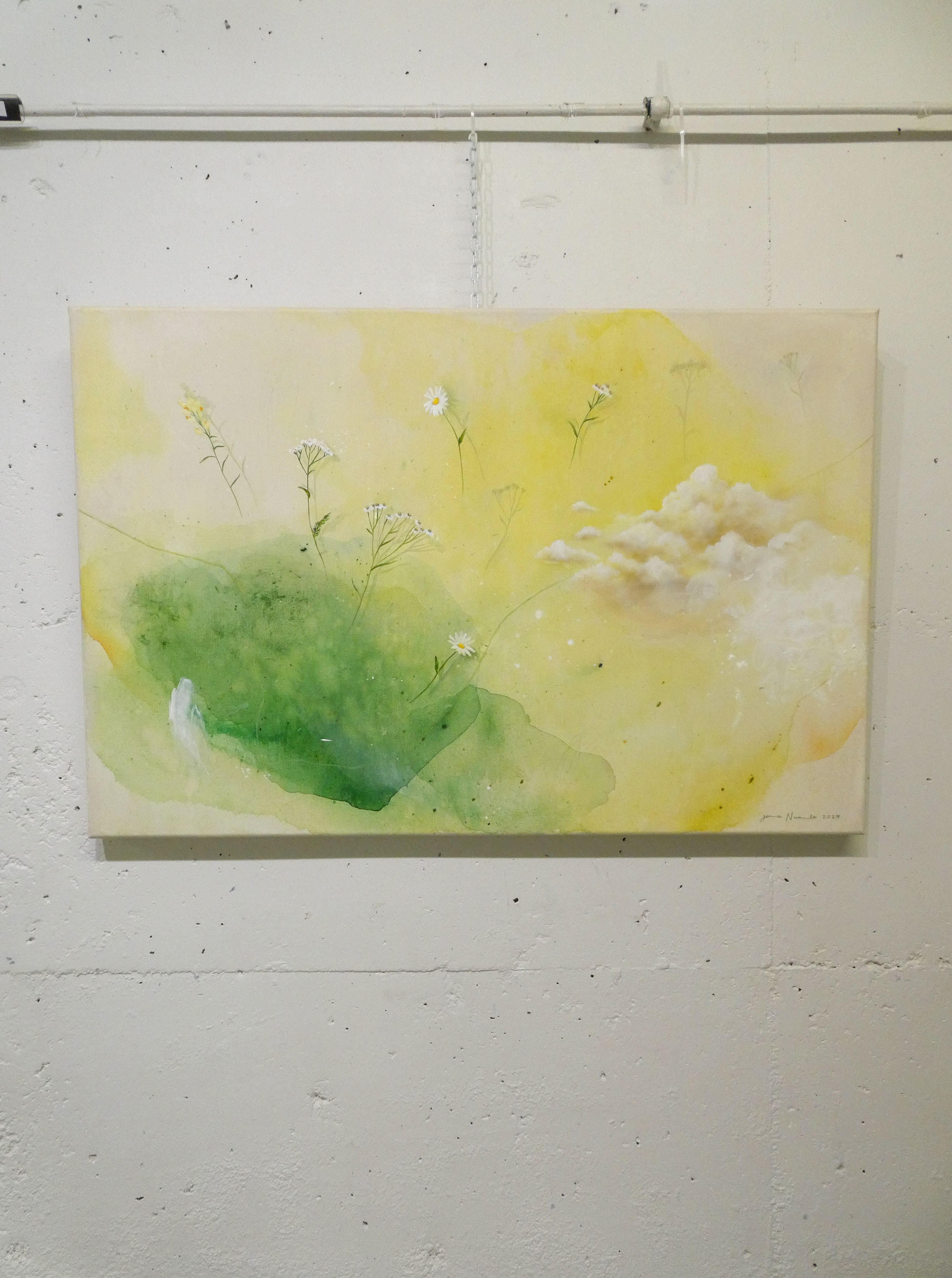 Teos on toteutettu 0,9 cm vahvuiselle vanerille, teoksen takana ripustuskiinnike, joka tuo teoksen kauemmas seinäpinnasta luoden kolmiulotteisen vaikutelman