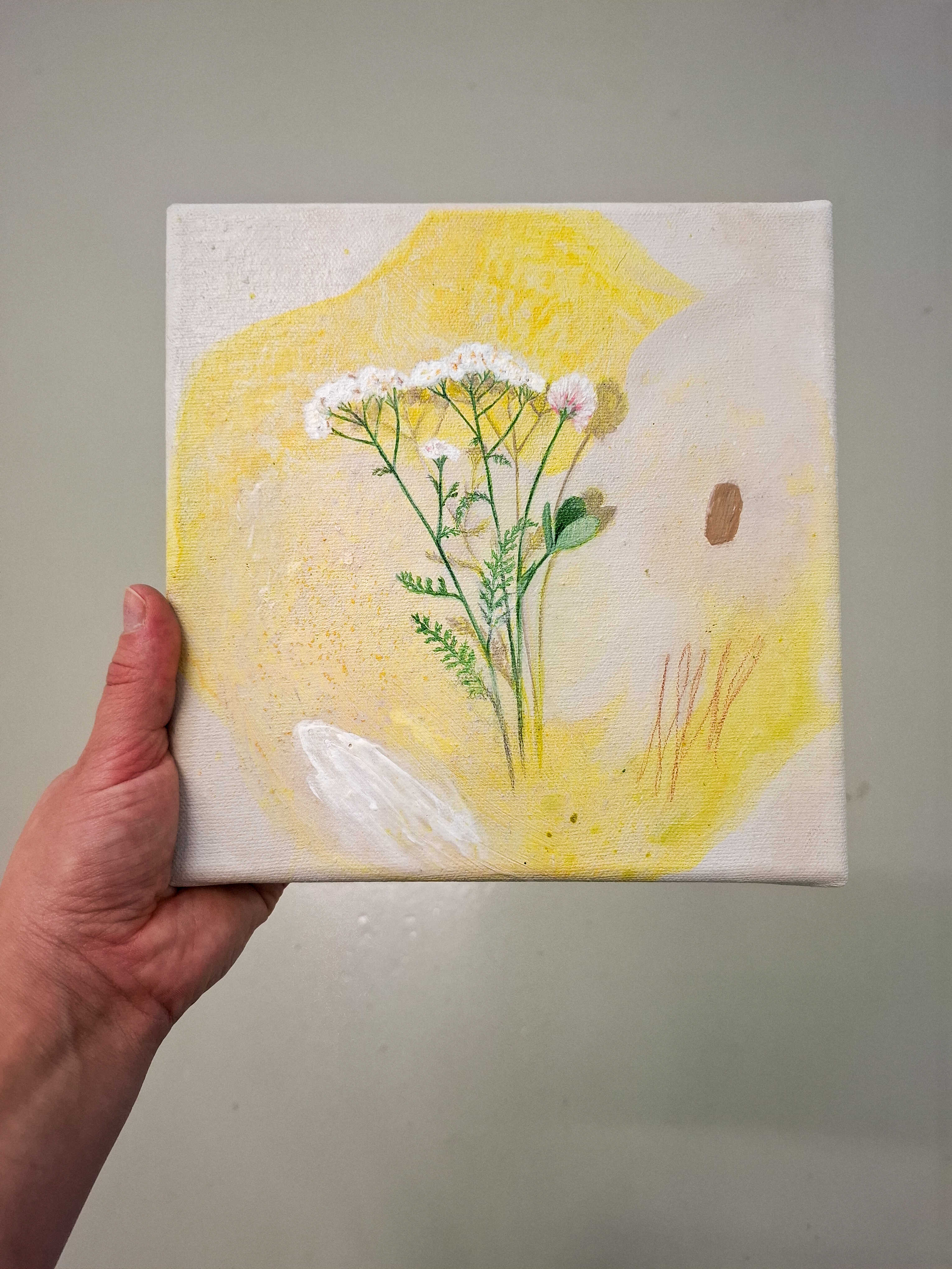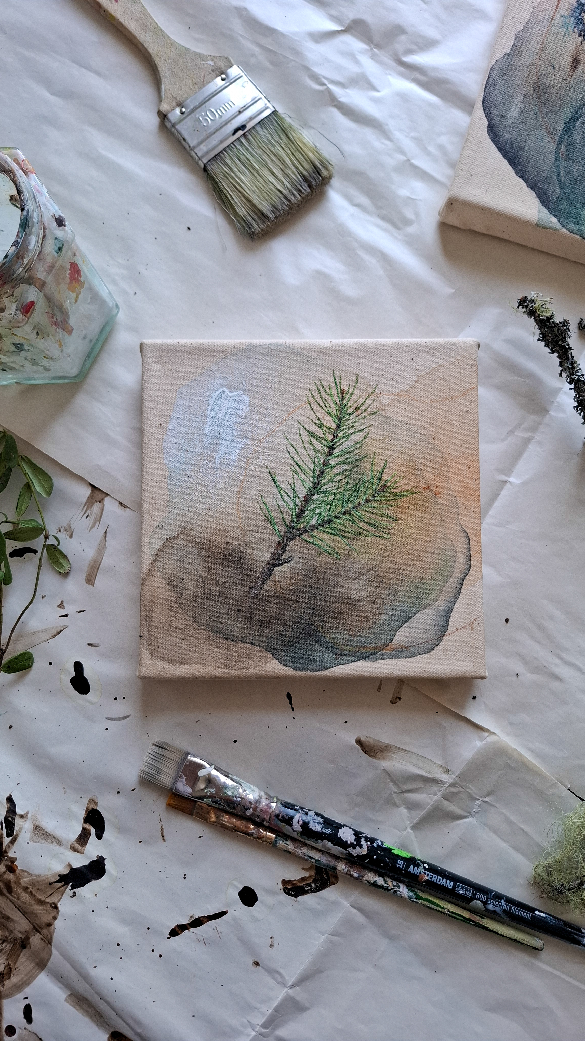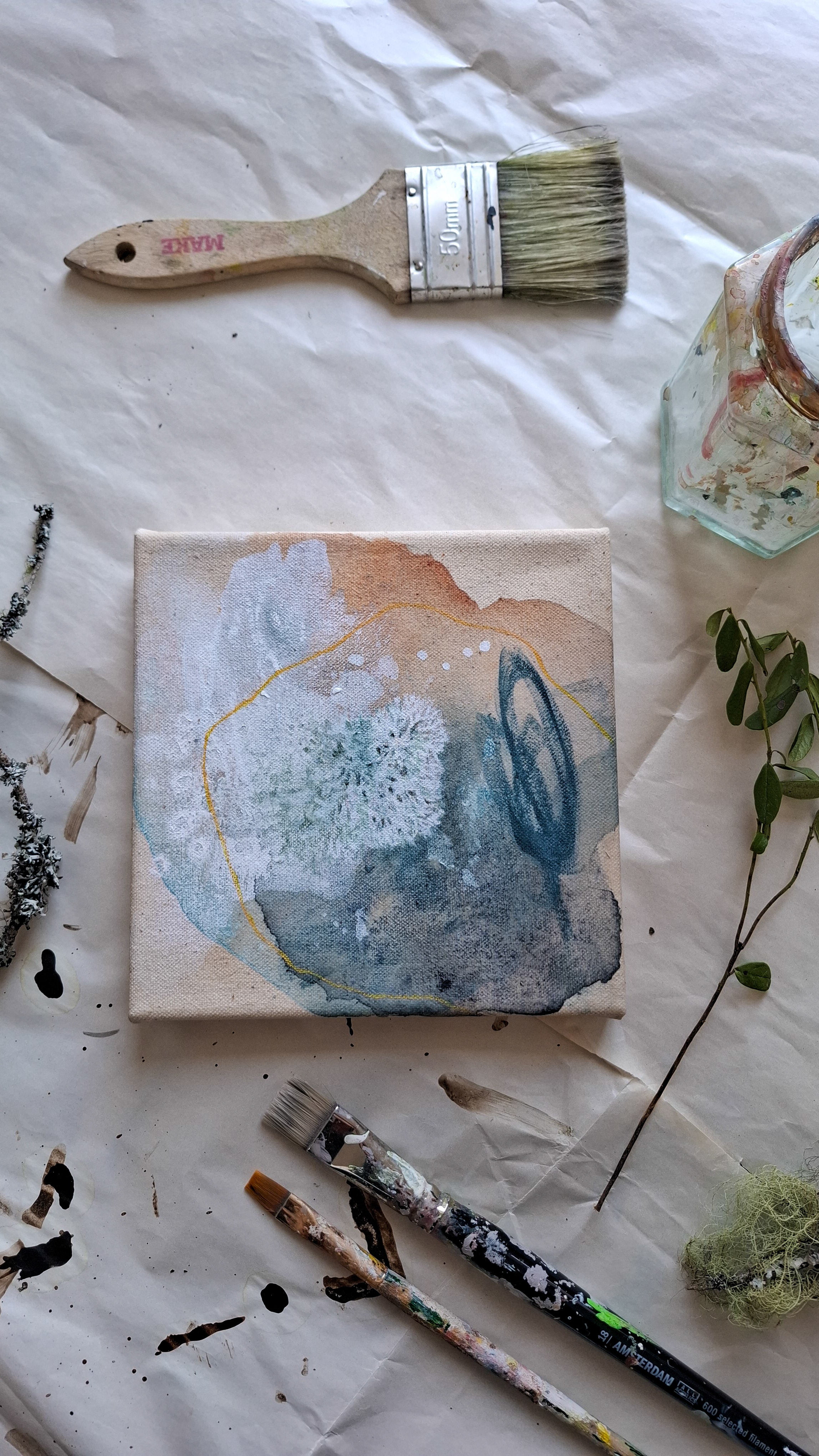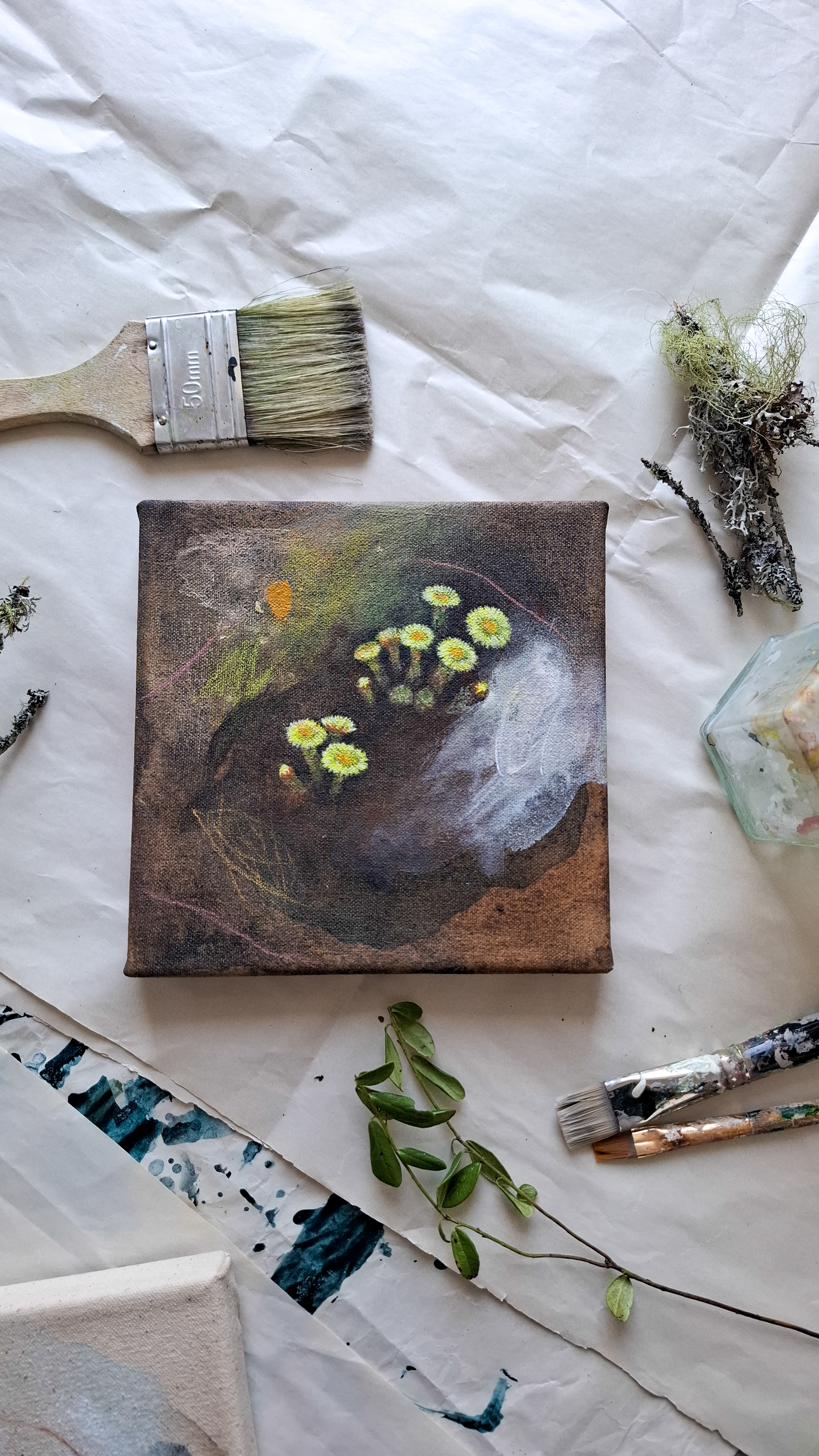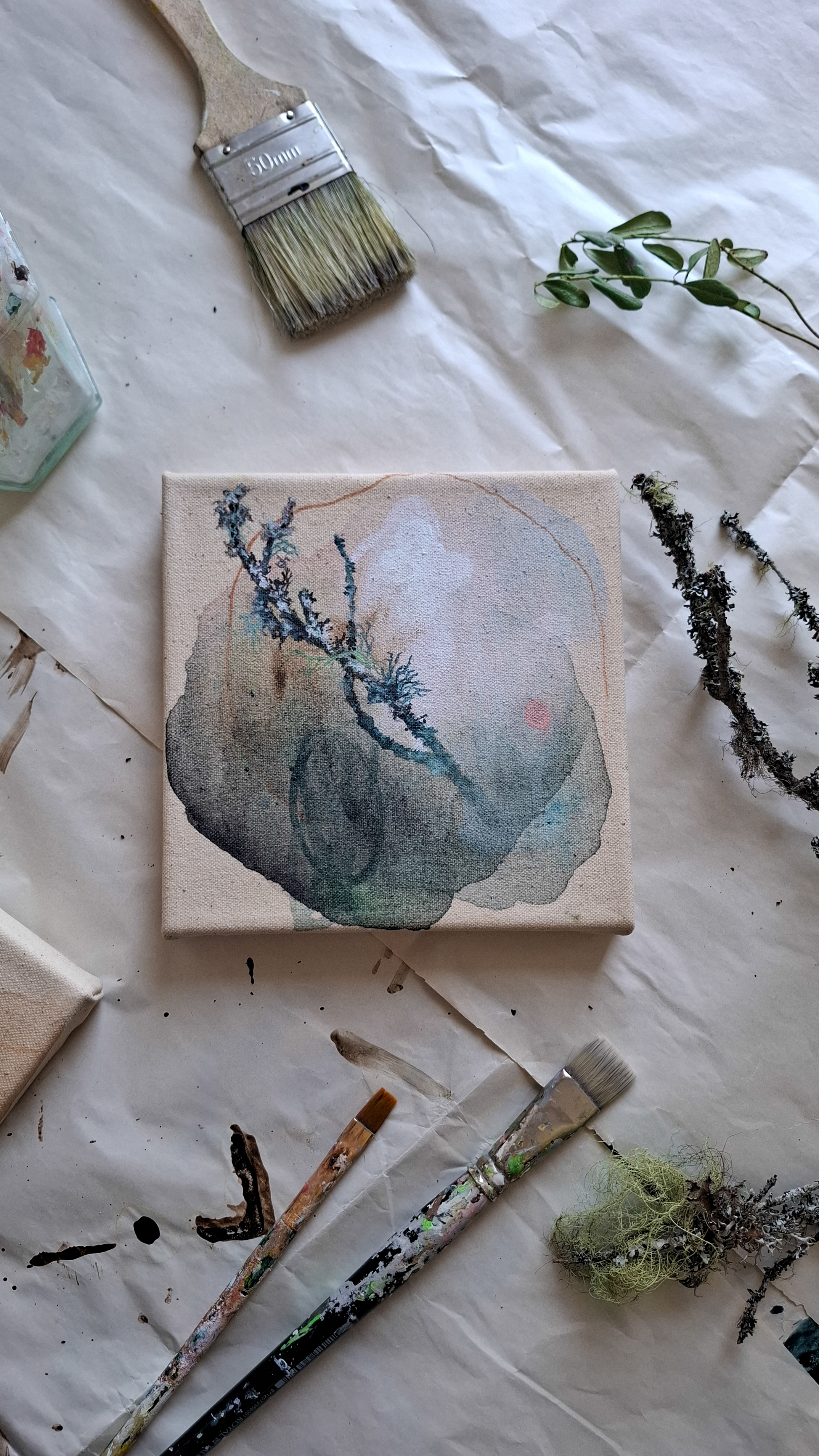 Teos on toteutettu 0,9 cm vahvuiselle vanerille, teoksen takana ripustuskiinnike, joka tuo teoksen kauemmas seinäpinnasta luoden kolmiulotteisen vaikutelman